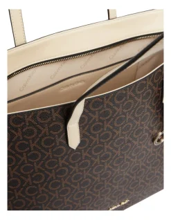 The Recycled Mini Tote Bag by Calvin Klein is complete with an embossed Monogram print on the front, short straps and metal hardware.