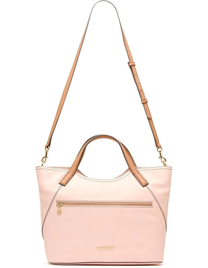 Sized to carry all your essentials, this leather tote offers everyday durability in NDM leather, while remaining easy to pair with a pale shell pink body and tan shoulder straps. Featuring a detachable cross-body strap, the bag is completed by further detail found in a secure zip fastening up top, and a gold zip external zip pocket and gleaming gold David Lawrence tag at the front.