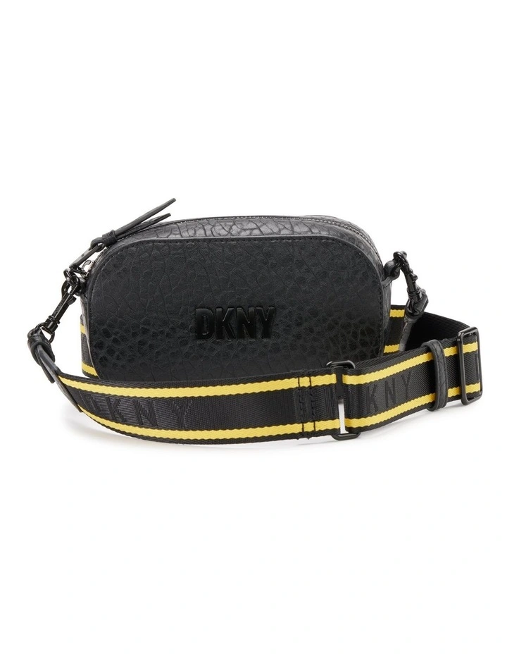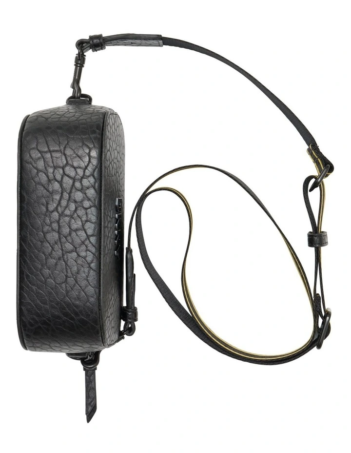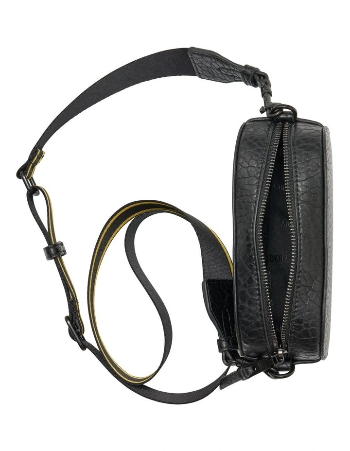 Round double branding mini camera bag with web straps. This is the perfect grab and go crossbody. Its easy and stylish.