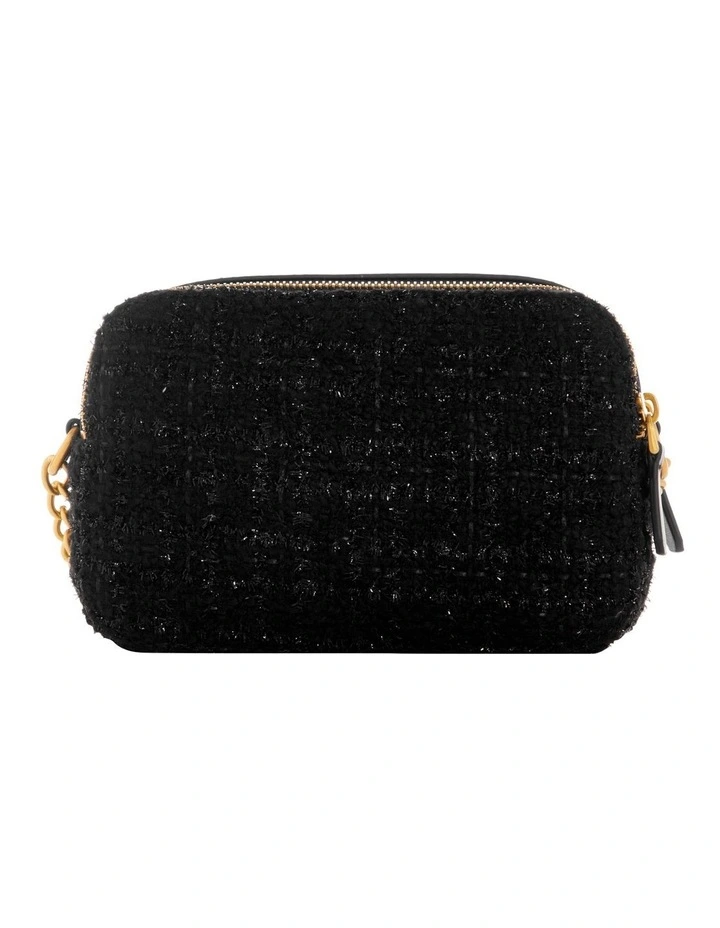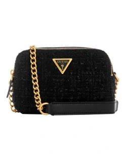 The black Giully Camera Bag from GUESS. A real statement piece among the accessory family, prepare yourself to have your outfit boosted to another level. A stunning outter pattern paired with gold hardware and beautiful logo display, this bag has it all.