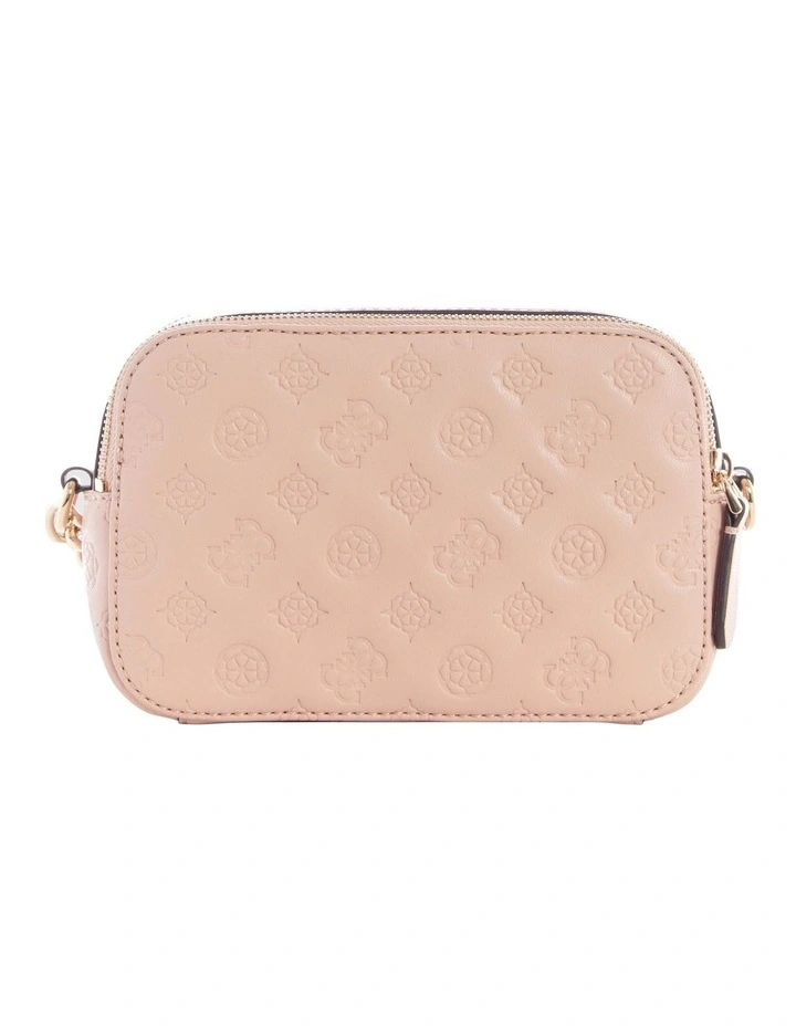 Features: Pale rose crossbody camera bag, Shiny gold hardware, Leather-look PU construction