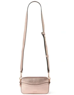 Adding just the right amount of glamour to your everyday, this rose gold camera bag carries all your essentials while pairing back effortlessly within your wardrobe. Lined with recycled cotton, the bag accents genuine Milano foil leather with gleaming rose gold hardware, finished with a top zip fastening, an adjustable, removable strap, a front slider pocket, and two zip pockets inside.
