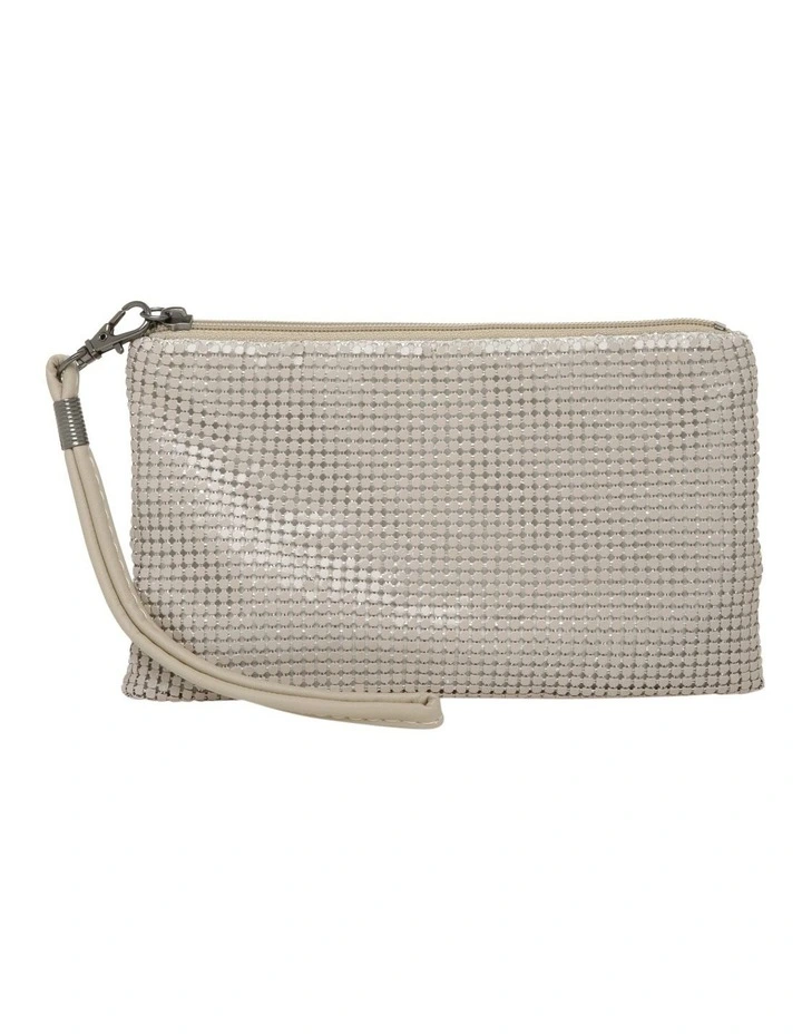 Olga Berg Mesh Wristlet in Natural OB5050. Zip top mesh wristlet with removable wristlet strap. The internal features two slip pockets.
